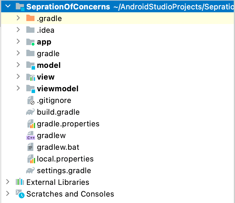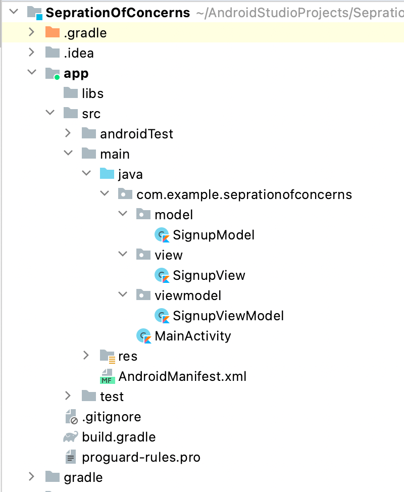 For example, if we consider MVVM architectural pattern for the project, then as per the separation of concerns principle, Model, View and ViewModel should have strict separation. App should follow these guideline, that is, Model components should not use ViewModel and View components. ViewModel components should not use View components. Also, View components should not use Model components directly. Most of the cases, in order to bring this separation, we create 3 different packages inside the app module, as shown in the snapshot below.
